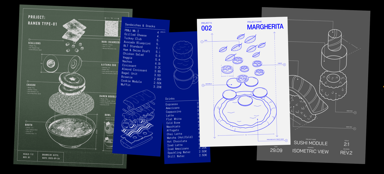 Deconstructed menus, ingredient posters, coffee brewing diagrams.